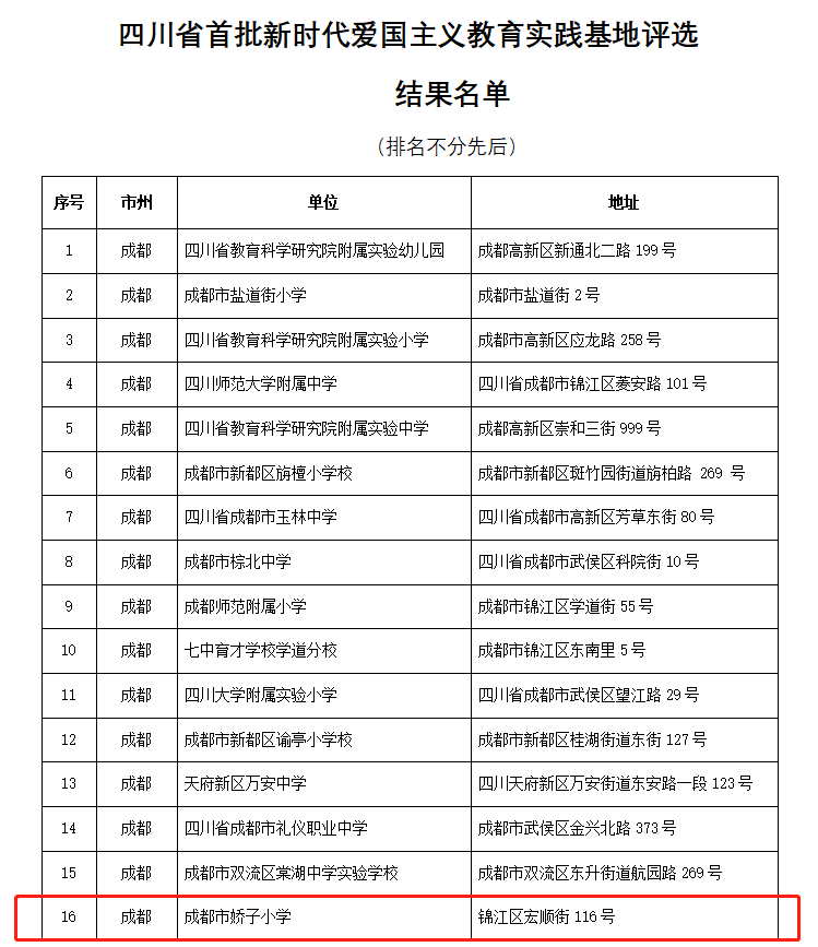 近日,四川省教育科学研究院公布了四川省首批新时代爱国主义教育实践基地评选结果名单,成都市娇子小学成功入选。