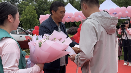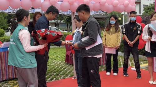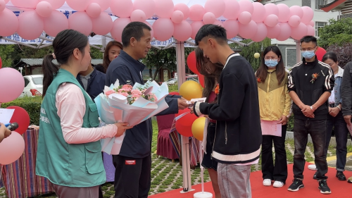 随后,丽江市民政局社会事务科科长和丽磊、古城区民政局局长李纯军、古城区民政局副局长和继松、古城区民政局社会事务股股长和振星共同为30对新人郑重颁发结婚证书,立行社工也为新人送上了象征浪漫爱情的玫瑰花束和“爱满古城 相约幸福”的祝福贺卡,
