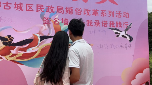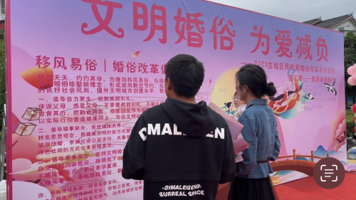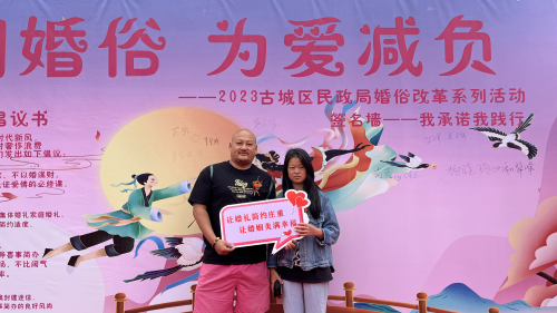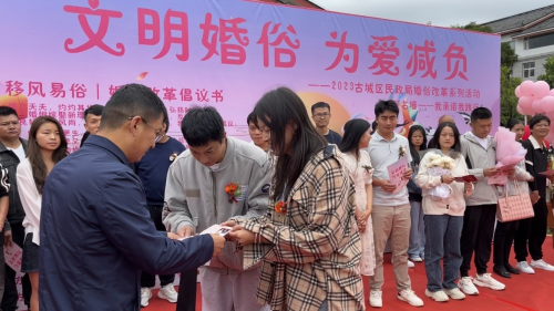 古城区民政局为进一步推进婚姻领域移风易俗改革工作,在全社会形成积极向上的婚礼新风尚,于七夕佳节创新启动了“文明婚俗 为爱减负”特色系列宣传活动。本次活动共分为五个环节,旨在帮助新人树立正确的婚姻观,家庭观和婚俗观。