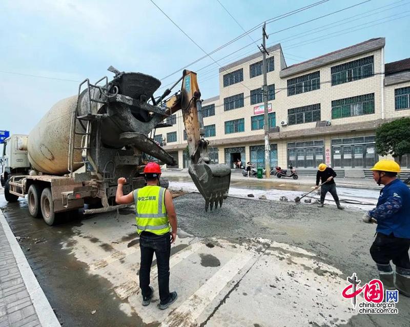 然而此时,正值石澧航道工程艳洲枢纽项目建设的黄金时期,施工现场工人们戴着安全帽,穿着反光背心,顶着骄阳支模、绑扎钢筋,船闸基坑内机械轰鸣,施工便道上车辆来回穿梭……一派热火朝天的繁忙景象。项目部常务副经理曾敬龙收到修复大雁中路任务后,却没有丝毫犹豫。“我们是中央企业,央企要积极承担社会责任,也要努力为人民服务。”他立刻组织施工人员召开专题会议,研究制定30天内完成道路抢修工作方案。鉴于8月28日是澧南镇中学开学报名日期,而道路的养护至少需要4天,项目部初步制定了8月24日前完成路面混泥土浇筑,28日前具备通车条件的施工部署。