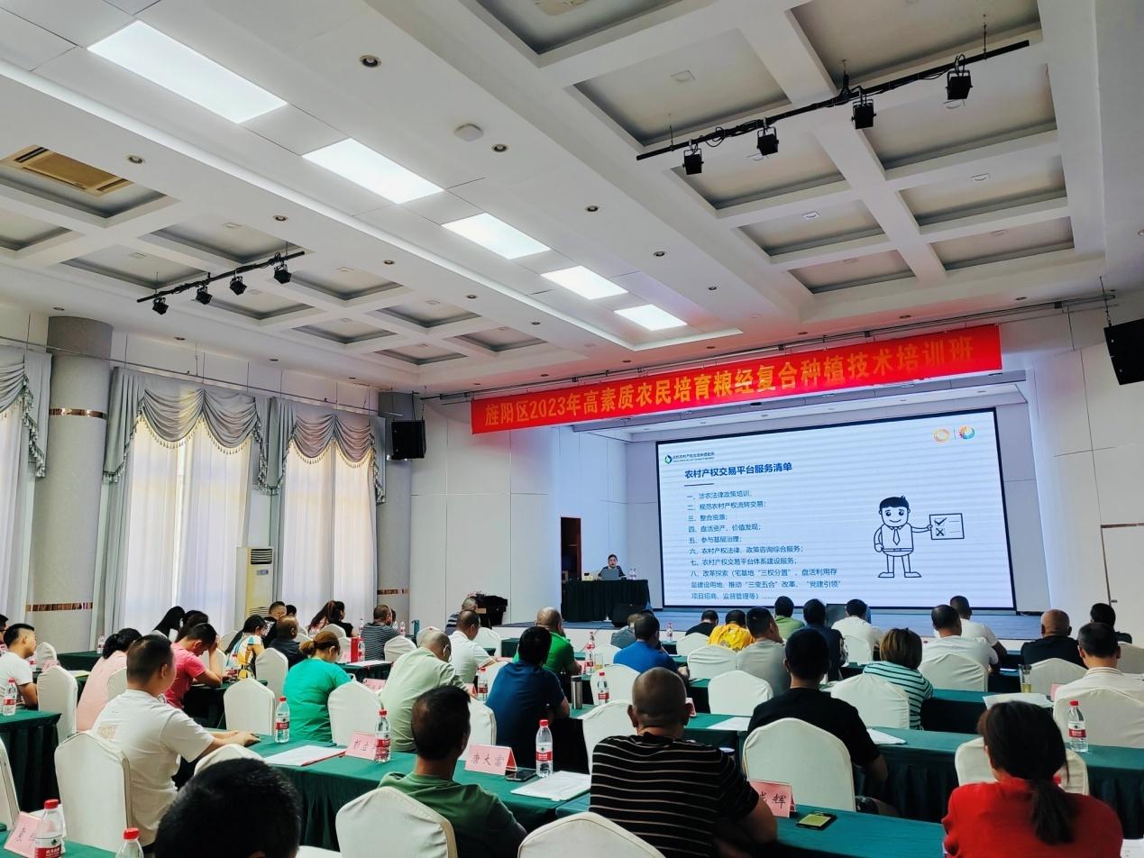 近日,成都农交所德阳所旌阳服务中心负责人在“旌阳区2023年高素质农民培育粮经复合种植技术培训班”上为辖区内100余名新型农业经营主体开展农村产权流转交易专题培训。