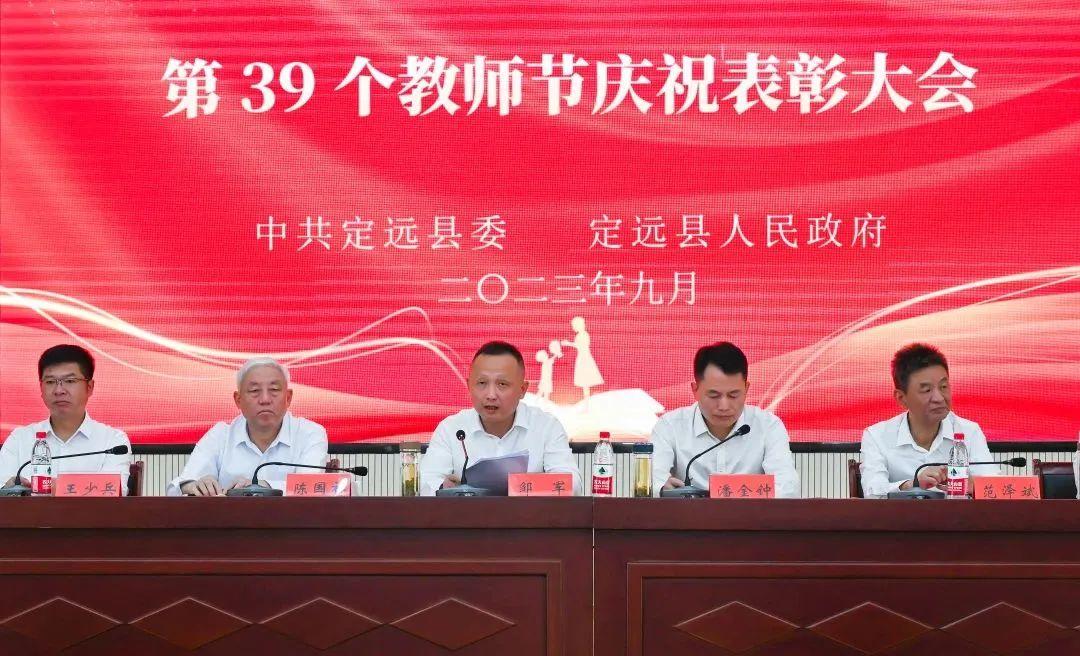 9月9日,安徽省定远县召开第39个教师节庆祝表彰大会,定远县委书记邹军出席会议并讲话,县委副书记、县长潘金钟主持会议,县领导陈国祥、范泽斌、王少兵、唐颖、戚建华、黄保云、刘星、陶应付、赵开俊、韩淑君等参加会议。
