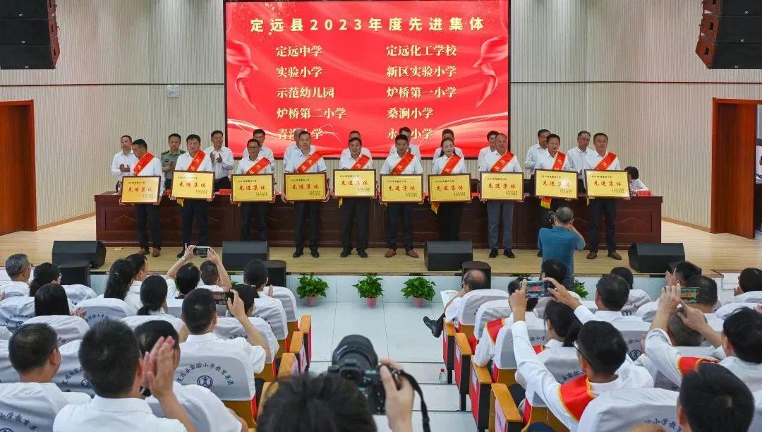 会议宣读了《2023 年教育系统先进集体、先进个人表扬通报》。为先进集体、优秀校长、优秀班主任、优秀乡村教师、模范教师、优秀支教教师代表颁奖。定远中学、优秀乡村教师代表、模范教师代表、优秀班主任代表等作了交流发言 ,2023 年新任教师代表宣誓。