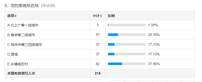 被调查的自闭症儿童家庭来自北上广等一线城市、省会等二线城市、地市州等三四线城市、县城、乡镇或农村的比例分别为1.39%、26.69%、17.13%、17.13%、37.96%,其中来自乡镇或农村的家庭中有37.8%认为家庭所在地能够提供的自闭症康复医疗资源“不充足,需要带孩子到较近的城市康复治疗(无需租房或住宿)”,43.90%认为“非常不充足,需要带孩子到较远的城市康复治疗(需要租房或住宿)”;来自县城的家庭中有21.62%认为家庭所在地能够提供的自闭症康复医疗资源“不充足,需要带孩子到较近的城市康复治疗(无需租房或住宿)”,27.03%认为“非常不充足,需要带孩子到较远的城市康复治疗(需要租房或住宿)”;来自地市州等三四线城市的家庭中有35.14%认为家庭所在地能够提供的自闭症康复医疗资源“不充足,需要带孩子到较近的城市康复治疗(无需租房或住宿)”,5.41%认为“非常不充足,需要带孩子到较远的城市康复治疗(需要租房或住宿)”;来自省会等二线城市的家庭中仅有10.53%的认为家庭所在地能够提供的自闭症康复医疗资源“不充足,需要带孩子到较近的城市康复治疗(无需租房或住宿)”,剩下的89.47%的家庭均认为“非常充足或比较充足”。调查结果表明湖南省自闭症儿童康复医疗资源集中在省会长沙,来自乡镇或农村、县城的自闭症儿童家长需要舟车劳累的带孩子外地康复治疗,这无疑更加重了他们的生活和精神负担。