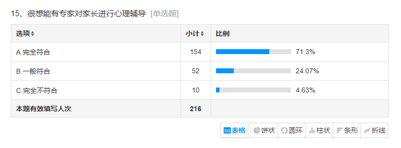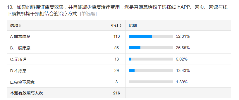 在“如果能够保证康复效果,并且能减少康复治疗费用,您是否愿意给孩子选择线上APP、网页、网课与线下康复机构干预相结合的治疗方式 ?”的调查中,选择非常愿意、一般愿意、无所谓、不愿意、完全不愿意的比例分别为52.31%、26.85%、6.02%、13.43%、1.39%,说明绝大部分家长在保证康复康复、能减少治疗费用的前提下愿意采用“线上+线下”、“机构+家庭”的治疗方式,也反映出自闭症儿童家庭对新的治疗康复模式的渴望。在“您是否愿意有相关专家能培训家长如何陪护患有自闭症的孩子”的调查中选择非常愿意、一般愿意、无所谓比例分别为76.39%、19.91%、3.7%,选择不愿意和完全不愿意的比例都是0;在“很想能有专家对家长进行心理辅导”的调查中选择完全符合、一般符合、完全不符合的比例分别为71.3%、24.07%、4.63%,表明自闭症儿童家长非常期盼得到专业的康复知识培训,长期承受很大的心理压力、期望可以得到有效的心理疏导。