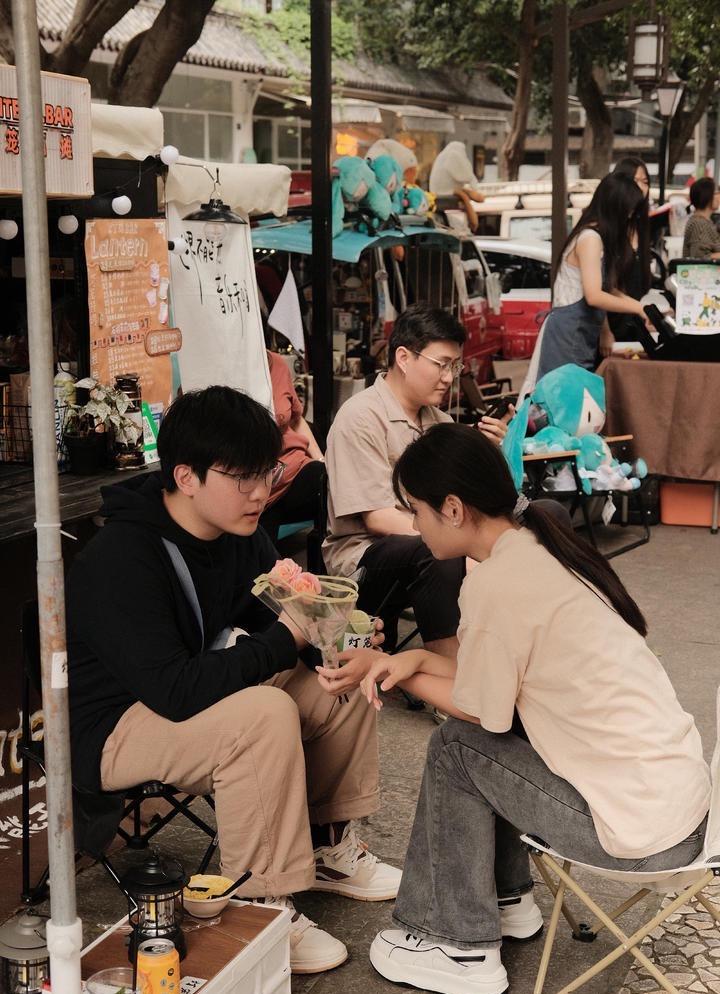 “芳草玉林大市集”把握“citywalk”都市漫游理念,以旅游目的地为目标进行市集打造,游客以市集为目的前来,不仅在市集消费,同时带动街区商业消费增长。而在摊主招募时,主办方优先选择素人摊主,保证市集的趣味性且不过度商业化,游客逛得开心,看得稀奇,摊主赚到钱后促进二次消费,“收摊后组局喝酒”“市集赚钱市集花”成为了市集的流行口号。