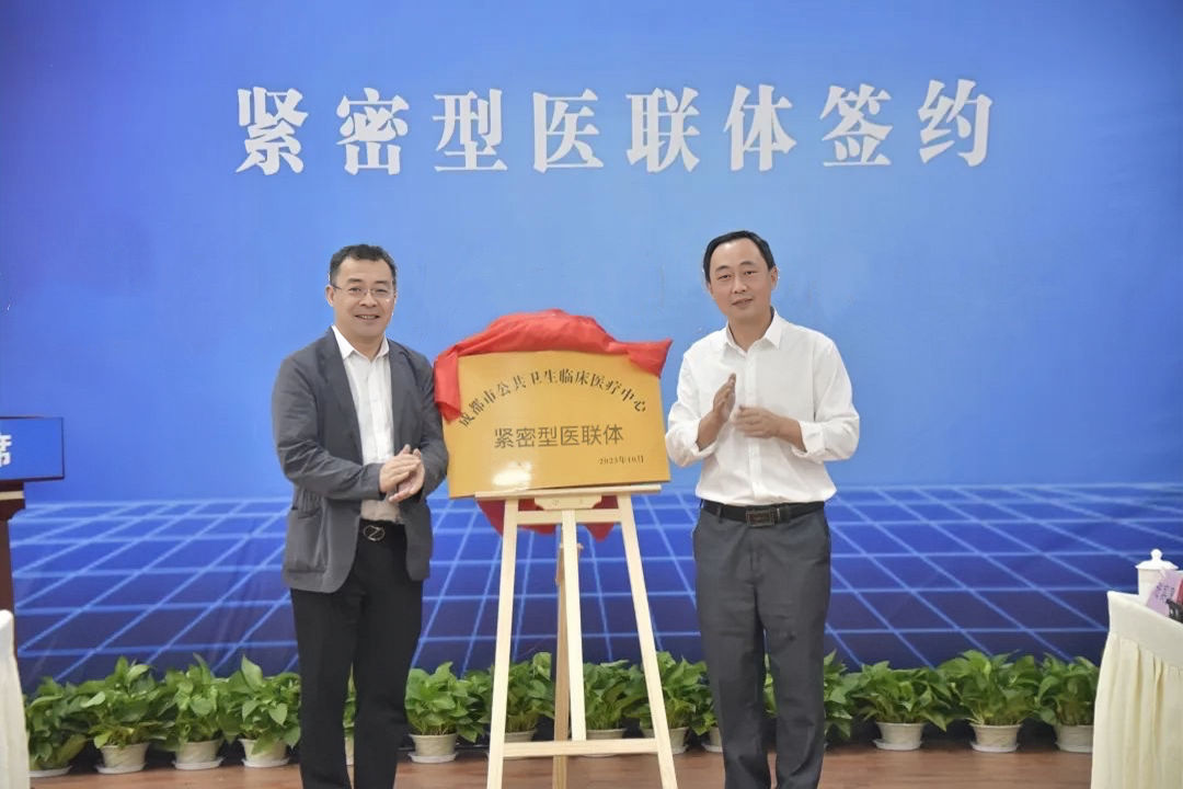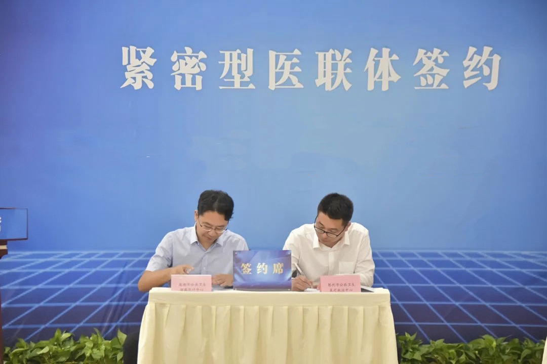 随后,成都市公共卫生临床医疗中心院长扎西、彭州市公卫中心院长施实勇代表双方签署《紧密型医联体合作协议书》。