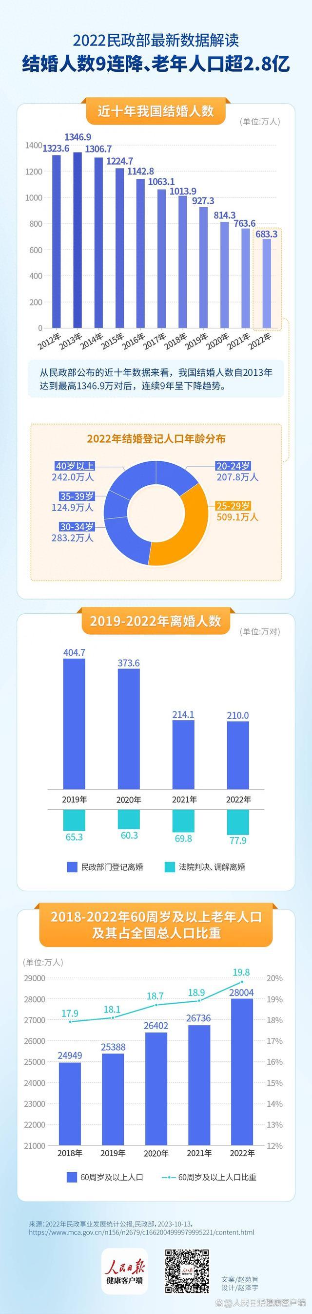 结婚人数连续9年下降,60岁以上老年人口已超2.8亿人......10月13日,民政部发布《2022年民政事业发展统计公报》,公报中披露最新的我国婚姻数据和老年数据,结婚人数已连续9年下降,离婚登记人数自2019年达到顶峰后,如今已处平稳下降趋势,除此之外,我国老年人口已超2.8亿人。