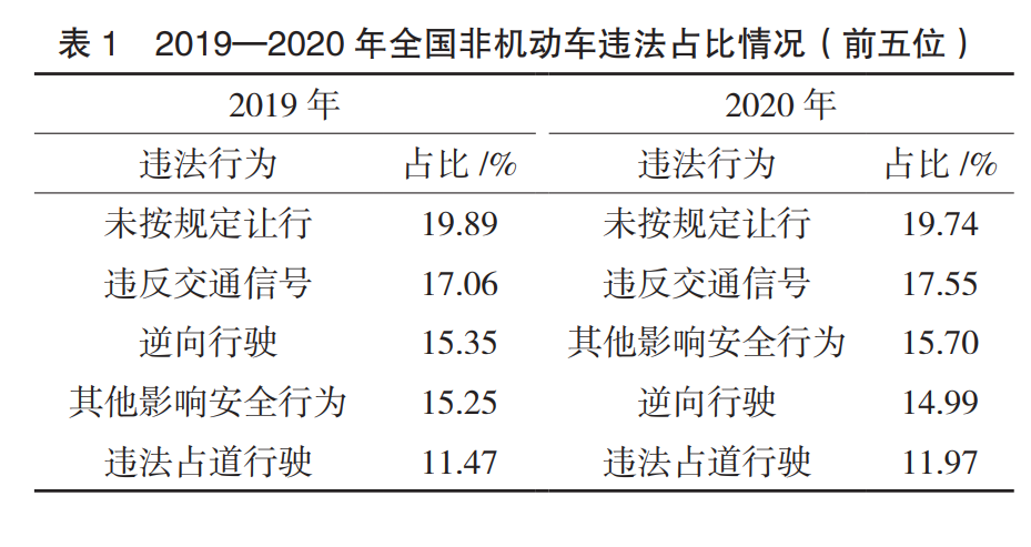 通过对不同城市近五年电动自行车负主要责任的事故数据进行统计整合发现,“违法占道行驶、逆向行驶、未按规定让行、违反交通信号”是电动自行车方造成交通事故的多发原因,与调研所得电动自行车违法行为处罚情况相一致。查阅2019—2020年道路交通事故统计年报得到表1,选取非机动车违法行为累计频率在80%的违法行为作为该年非机动车交通事故主要违法致因。可以看出“违法占道行驶、逆向行驶、未按规定让行、违反交通信号”为非机动车交通事故的主要违法致因,与调研情况相一致。