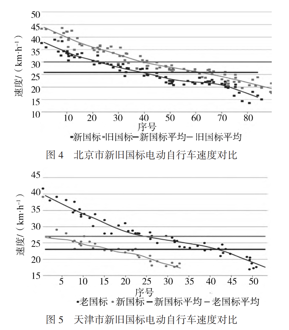 对2019年北京市、天津市的新旧国标电动自行车车速调研数据进行分类统计和分析见图4、图5。