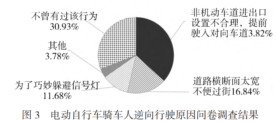 在对骑车人的问卷调查中发现,62.34%的非机动车驾驶人表示有过逆向行驶的行为,其中44.77%是由于非机动车道进出口设置不合理,骑车人为图方便而采取逆行行为。除此之外,部分骑车人为避免等待红灯,趁着左转相位驶入所在道路的对向车道继续前行。见图3。
