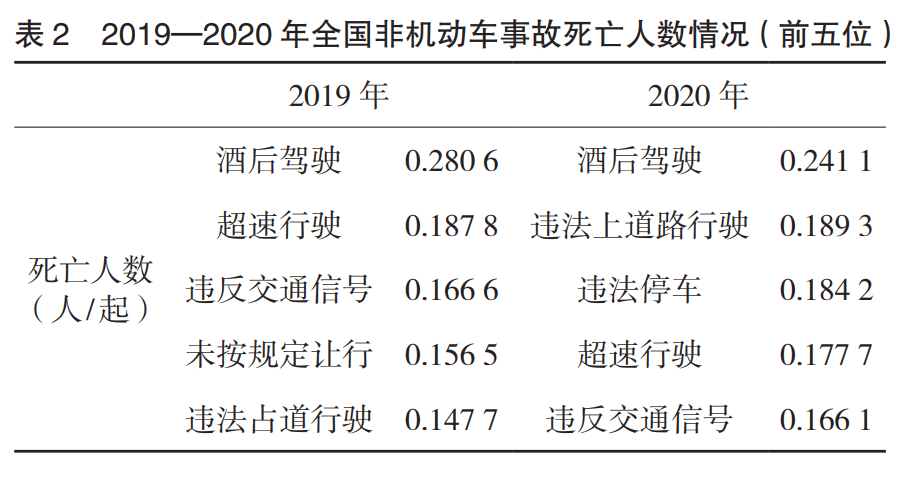 观察2019—2020年全国非机动车事故死亡人数情况中排名前五的违法行为,见表2。