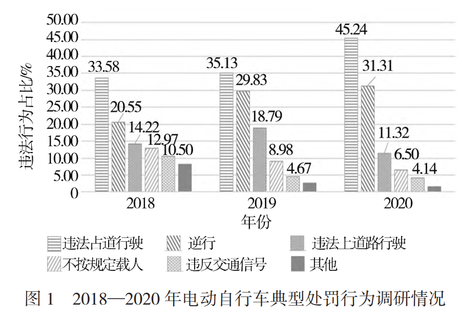 选取多个拥有较高电动自行车保有量且车辆使用率较高的城市作为调研对象,并以调研收集的电动自行车交通事故数据及违法处罚数据作为依据,得出2018—2020 年电动自行车典型处罚行为,见图1。