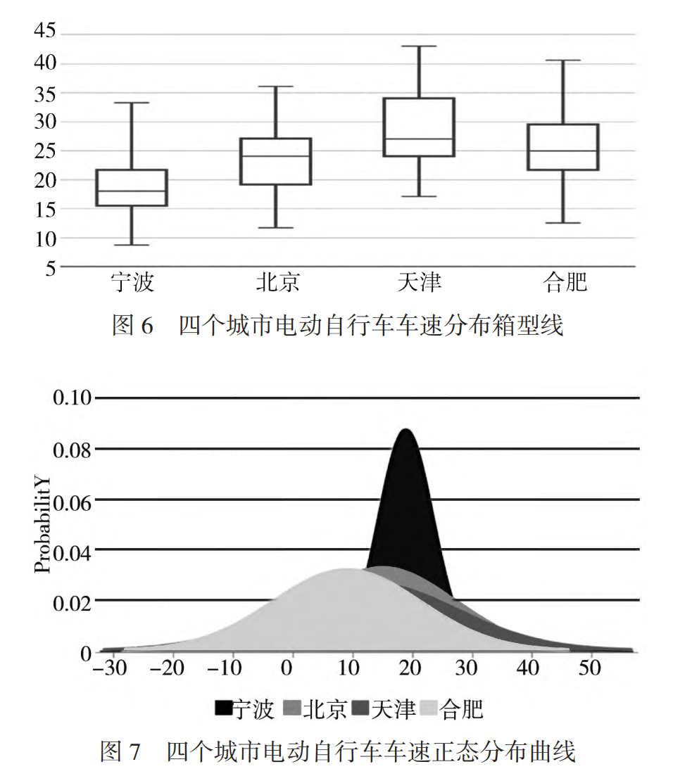 在经过对2019年宁波市、北京市、天津市、合肥市四个城市的整体电动自行车速度进行深入调研后得出:(1)整体车速控制在25km/h左右。四个城市车速分布箱型线和车速正态分布曲线见图6。可以看出,天津市的50位车速已略高于25km/h,85位车速显著高于25km/h;北京市与合肥市情况相仿,50位车速均在25km/h左右,85位车速略高于25km/h,但合肥市的整车速要略高于北京市;宁波市整体车速最慢,即使是85位车速也略低于25km/h,大多数电动自行车都被控制在新国标规定的车速范围内。(2)部分城市车速管理工作效果显著。从四个城市车速正态分布曲线见图7。可以看出,宁波市车速正态分布曲线形态与另外三个城市有着显著区别,“瘦高”的特点尤为突出且85位车速位于25km/h附近,这说明宁波市电动车速分布较为集中,严格遵守新国标的车速规定,从侧面说明宁波市电动车管理较为井然有序。