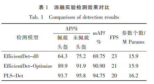 通过消融实验,比较 EfficientDet-d0、EfficientDet-Optimize 和 PLS-Det 模型的检测效果,具体结果见表 1。由表 1 可知,相较于 EfficientDet-d0 模型,改进后的 EfficientDet-Optimize 模型 mAP 提高了 30.3%,检测精确度显著提高;由于该数据集中两类多为小目标,而且存在不少互相遮挡的现象,底层特征层的引入将显著丰富小目标及被轻微遮挡目标的特征。本文改进的PLS-Det模型检测精确度可达到95.8%,比EfficientDet-Optimize模型提高了4.2%。实验结果表明,本研究提出的PLS-Det检测模型通过重新选择特征图层和引入PLS模块,在保证计算效率稳定的同时,可以显著提高初始EfficientDet模型的检测精确度。