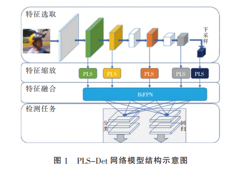 对主干网性能进行深入研究后发现,相同尺度、不同层级的特征层,对于特征的表征能力也不尽相同。低层特征图可以作为高层特征图在小目标及被轻微遮挡目标检测能力缺失时的一个很好的补充。由此,重新设计主干网EfficientNet-b0中的特征图层。主干网EfficientNet-bO的结构如图2所示。首先,引入较低级别的特征图C2补充待检测目标细节特征:然后,对照具有相同特征尺度的C4和C5层,C4_1和C5_1层的分辨率与后续C4_2和C5_2层一样,但宽度更小,考虑到后续PLS-Det将新增特征缩放层,由此剔除C4_1和C5_1层,将高语义层C4_2和C5_2层选为骨干特征层以添加网络的语义特征;最后,骨干网特征图层为C2、C3、C4_2、C5_2层,结合C5_2层下采样计算得到的顶层特征图,将这些特征图层所构造的新主干网络称为EfficientNet-Optimize,对应的检测模型为EfficientDet-Optimize。