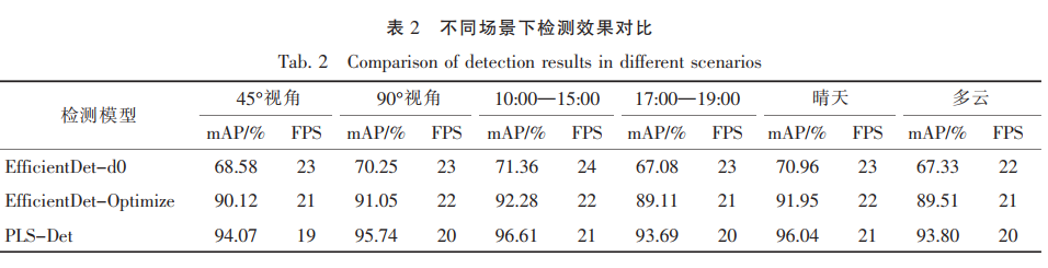 为检验检测模型对不同场景的适应性,分别对不同视角、时间段和天气进行分类检验,不同场景下检测效果对比见表2。由表2可知,在不同场景下PLS-Det检测模型的检测精确度均高于其他两个检测模型,且计算效率较稳定。PLS-Det检测模型在45°视角、弱光照(17:00-19:00时间段、阴天)场景下的检查精确度虽然有一定程度的降低,但依然维持在较高水平,表明PLS-Det检测模型能适应不同场景下的检查效果要求。
