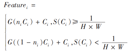 其中:Ci 是第 i 个通道的特征值;G 是 GhostNet 网络;ni 代表缩放尺度;S 代表 Softmax 操作,用于计算每个通道的得分,得分是指每个像素位置对于通道特征的贡献;H 和 W 分别代表特征图的长和宽。将每个通道的得分与平均贡献得分 1/(H × W)相比较,如果不小于平均贡献得分,将特征缩放尺度设定为 ni ;反之,则设定为(1 - ni )。