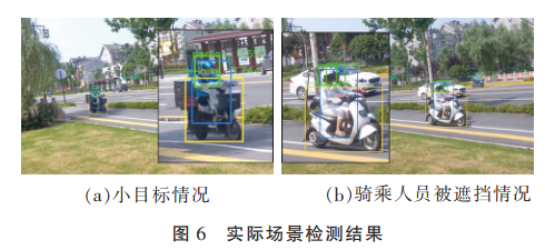为进一步验证检测模型的实际效果,将Effi-cientDet-d0、EfficientDet-Optimize和PLS-Det模型的检测结果,与人工检测的单位时间(每5s为l个间隔)安全头盔佩戴率进行对比。以南通市城山路和洪江路两个路段为例(如图5所示),相较于人工检测结果,EfficientDet-d0、EfficientDet-Optimize和PLS-Det模型检测结果的平均误差率分别为27.5%、13.3%和8.2%。如图6所示,实际场景检测结果中,红色框代表未佩戴头盔,绿色框代表佩戴头盔,黄色框代表电动自行车,蓝色框代表骑乘人员。由图6可以看出,PLS-Det模型能准确检测小目标或被遮挡骑乘人员的安全头盔佩戴情况。综上,PLS-Det模型可用于检测电动自行车骑乘人员安全头盔佩戴行为,且精确度、可靠性高。
