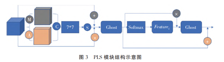 PLS模块对特征图进行简单的空间注意力计算,得到物体的主要区域。计算得注意力为Scorei = S(φ(v([max(pi ),mean(pi )]))) (1)其中:pi 代表所有通道中在像素位置i上的向量值;max代表最大池化操作;mean代表平均池化操作;[]代表合并操作;v代表卷积计算;φ 和S分别代表Relu和Sigmoid 函数。