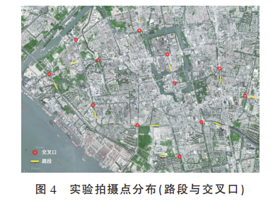 为了使检测算法能适应更多实际的交通场景,实验选取了南通市城区范围内的典型路段和交叉口,共计10条路段和12个交叉口,如图4所示。按不同视角(45°和90°)、时间段(10:00—15:00和17:00一19:00)、天气(晴天和多云)分类采集电动自行车交通流视频,以保证场景的多样性,并且对视频进行预先的标注和拆分以满足算法训练要求。采用DarkLabel 标注工具对视频样本进行标注,标注对象包括电动自行车、人(骑行人、乘坐人)和头部(佩戴头盔、未佩戴头盔)。共搜集到56段高清视频,每段视频约15~25min,每个视频的采样间隔(区间)长度内10s,整理获得6820幅图像,每幅图像平均有3.8辆电动自行车。其中,路段占比45.8%,交叉口占比54.2%;45°视角占比55.3%,90°视角占比44.7%;10:00—15:00时间段占比58.6%,17:00—19:00时间段占比41.4%;晴天占比60.5%,多云占比39.5%。标注后总样本12564个,其中正样本(佩戴安全头盔的矩形框)5408个,负样本(未佩戴安全头盔的矩形框)7156个。将数据集随机分为训练集(正样本3785个、负样本5009个)、验证集(正样本540个,负样本715个)和测试集(正样本1083个、负样本1432个)3个不相交的子集,占比为7:1:2。