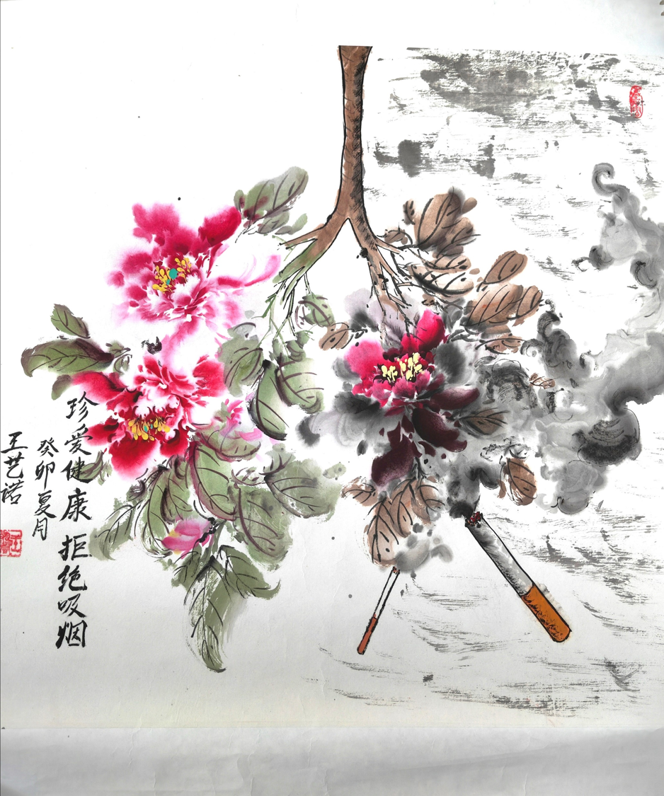 作品轮廓以气管和肺的形状构造而成,用国画牡丹花表达。绘画左半部分颜色鲜艳,代表左肺干净清爽,未被烟污染,呈现健康状态;绘画右半部分颜色暗沉,代表右肺被烟熏污染,呈现不健康的状态。两部分形成鲜明对比,体现吸烟有害健康。
