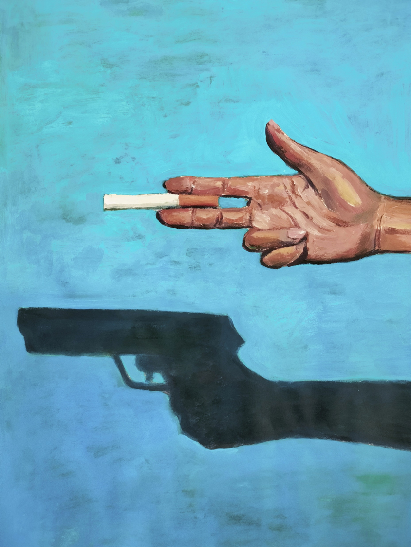 一只手递出一根香烟,投影则是伸出一支手枪。以冷色调蓝色作为背景,渲染出一种惊心动魄的气氛。作品命名为《杀手》,体现出烟草可杀人于无形。