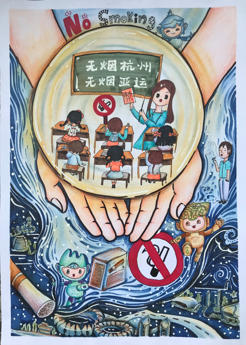 作品以“无烟亚运”为主题,主体画面为一双手掬起一个巨大的气泡,隔绝了二手烟雾的侵袭,寓意通过开展控烟健康教育,通过无烟杭州建设助力绿色亚运,在全社会建设和营造无烟氛围,为青少年构建起一个无烟、绿色、健康的清新环境,保障下一代健康成长,实现健康中国目标。