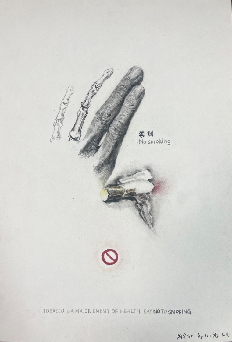 该作品是以一只苍老的手作为载体,大拇指是用一根未被熄灭的烟来替代的,暗示了抽烟者的生命也随着这根烟头在一点点逝去;整只手的下方是一个暗红色的禁止标识,标识着要禁止吸烟。