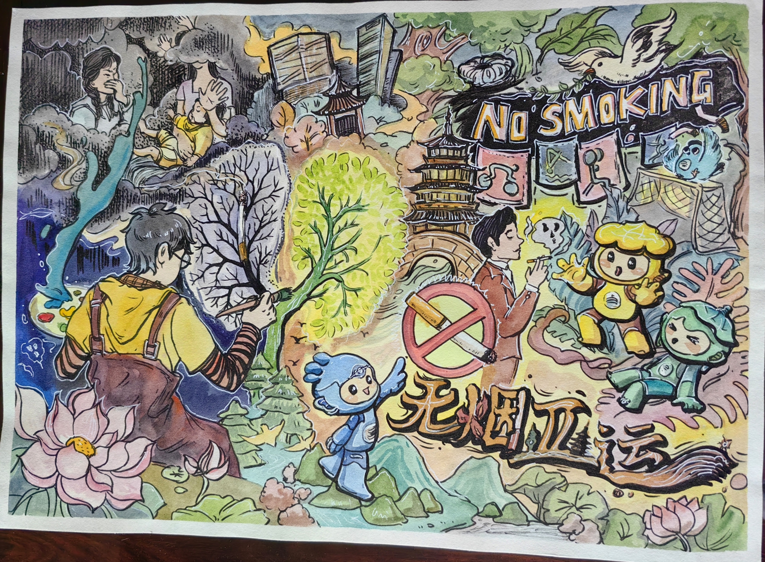 吸烟者大量长期吸烟,其整个肺脏会被染黑,同时吸烟所产生的烟雾,形成的二手烟,更会让非吸烟者深受其害……无烟亚运少年绘,我运用画笔的力量,强调吸烟危害,鼓励控烟,不给自己及他人的健康带来不良影响,争创无烟环境,努力实现无烟健康亚运。