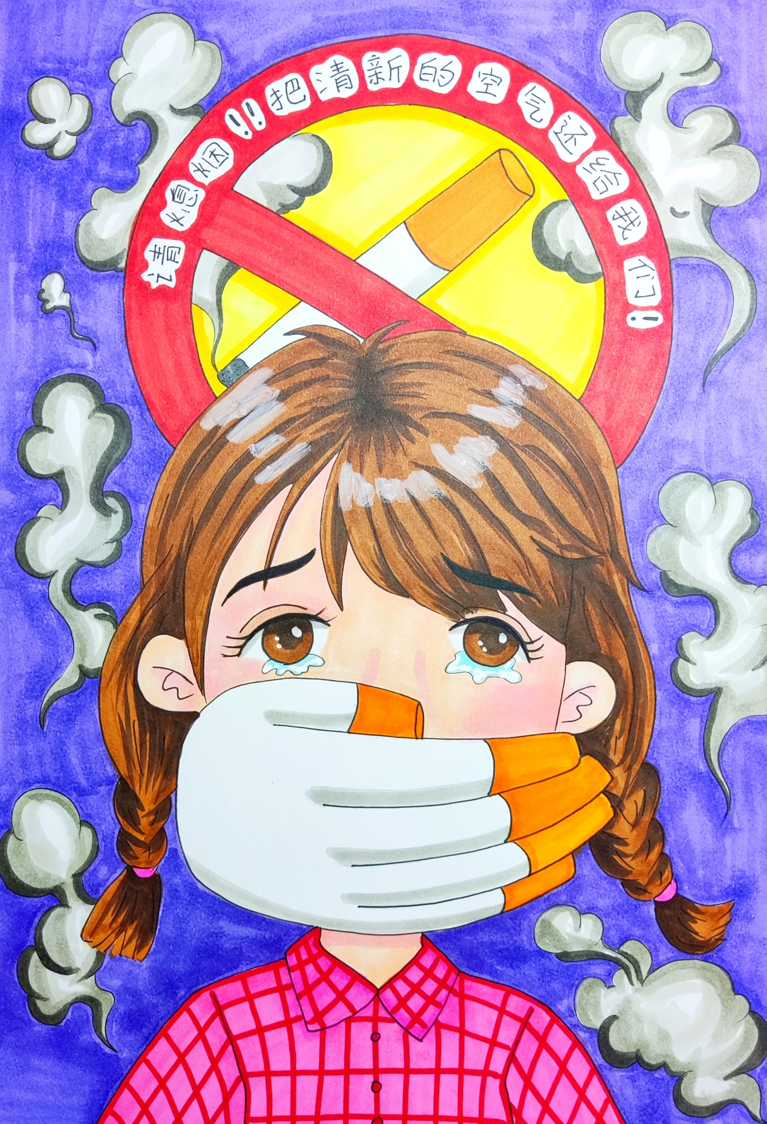 一个哭泣的小女孩,被一只香烟组成的手捂住了口鼻而无法呼吸。她的周围飘散着烟尘,烟污染了空气,二手烟三手烟的危害非常大。身后大大的禁烟标志提醒着我们:请熄烟!把清新的空气还给我们!