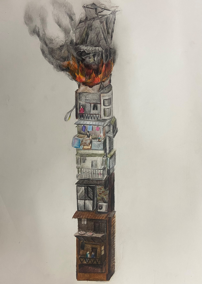 以下方未被香烟伤害的温馨家庭与上方被寝室的危房形成对比,被香烟伤害的生命和家庭如同灰烬一般消散。火光刺目,浓烟滚滚,唯有捻灭那支香烟才能拯救那座危房。