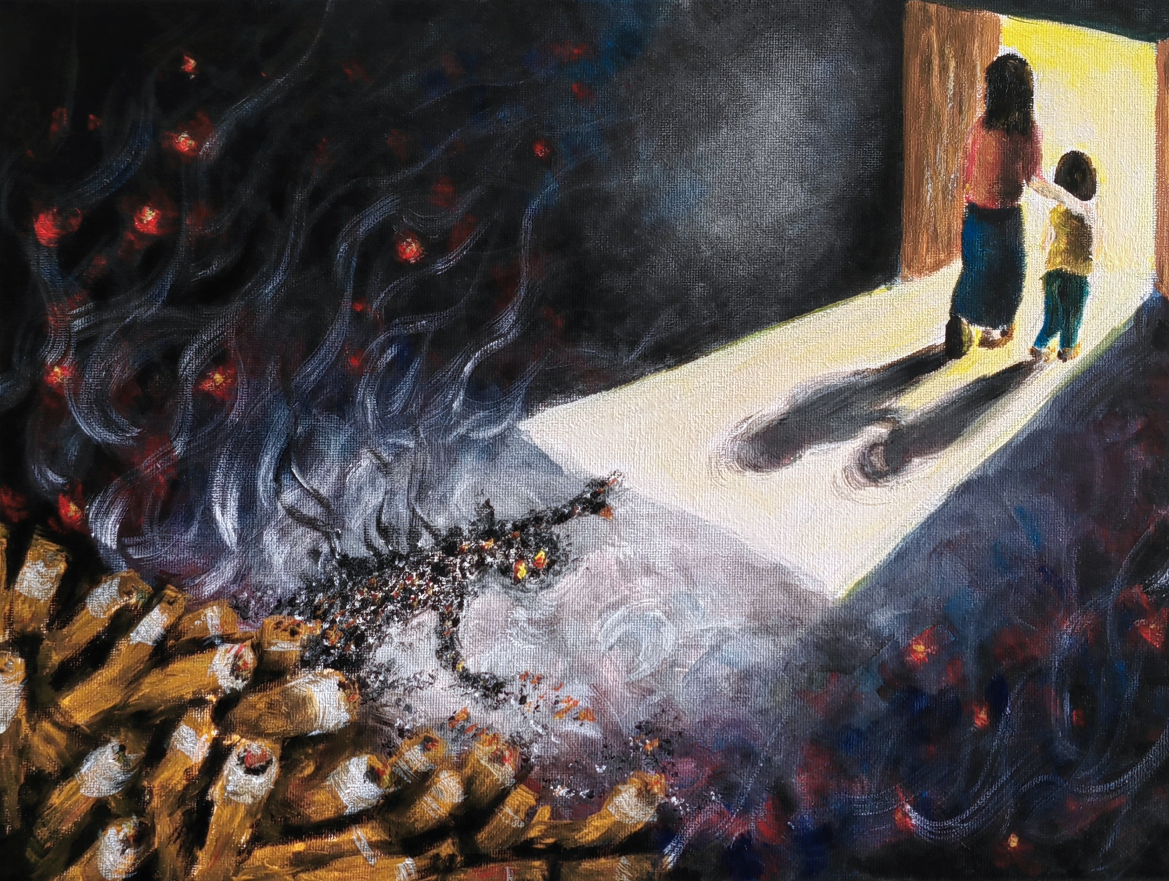 昏暗的屋内烟雾弥漫,香烟的火星犹如妖魔的眼睛在窥视着一切,一个已化作烟灰的男人被埋在烟头之下,挽留头也不回的朝屋外离去的妻儿。嗜烟如命者,被吞噬的除了自己的健康和生命,还有家人的,最终将对家庭造成无法挽回的后果。