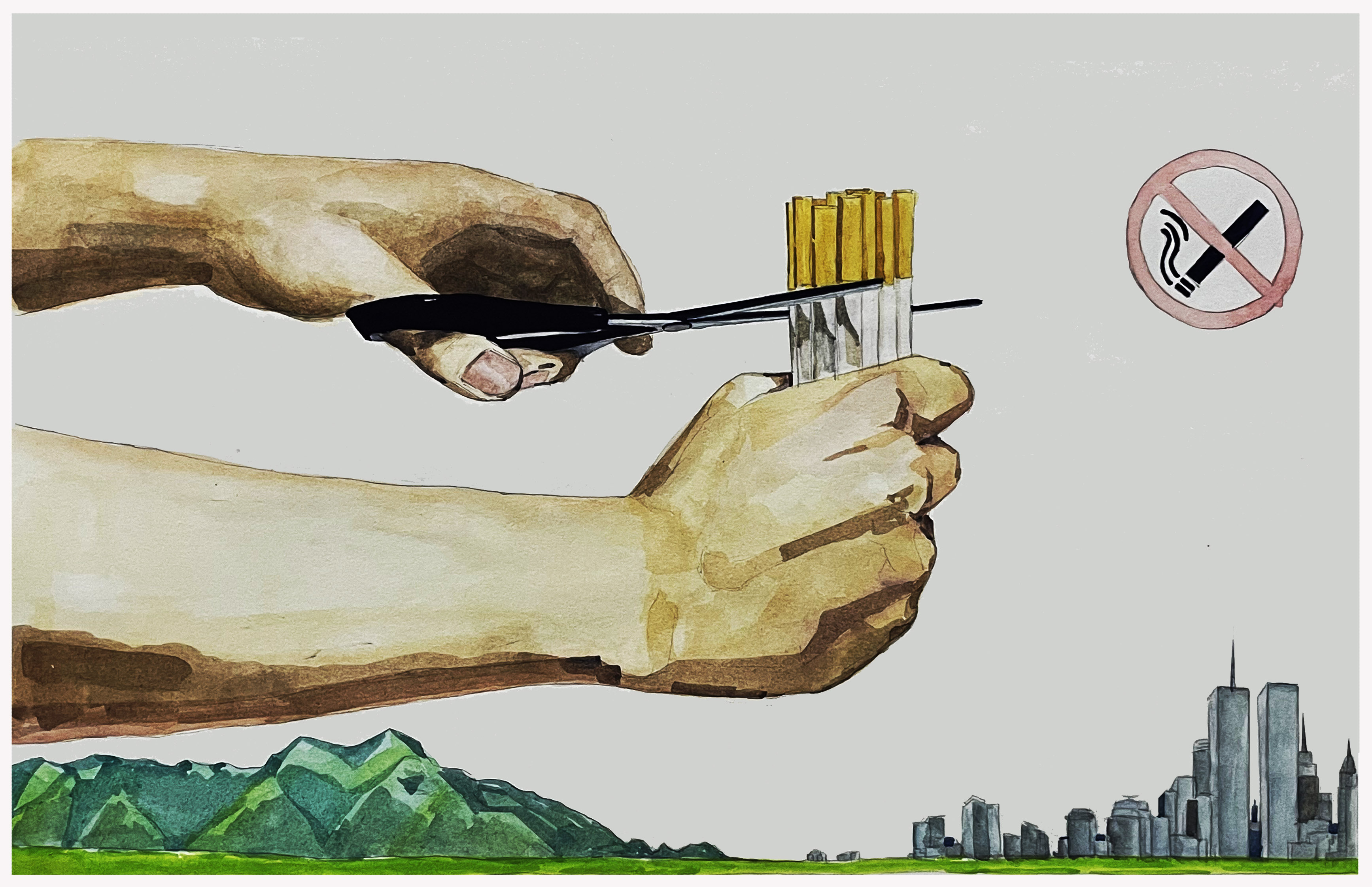 该绘画作品采用了水彩的绘画方式。主要是以一双手用剪刀剪掉香烟为主体,背景是以天空、高山和房屋建筑为辅,体现了香烟的危害,影响的不仅仅只是人的本身还有我们所生活的生态环境,。所以,为了保护我们人类赖以生存的家园,我们要学会斩草除根远离危害。
