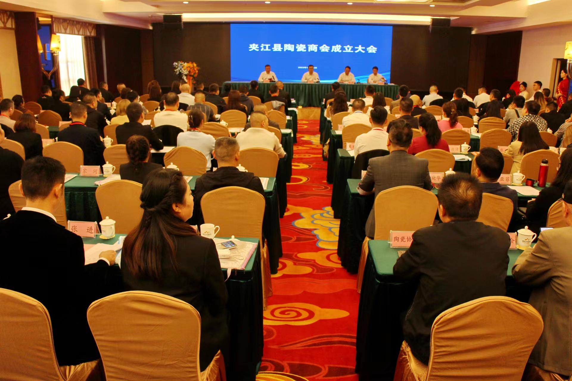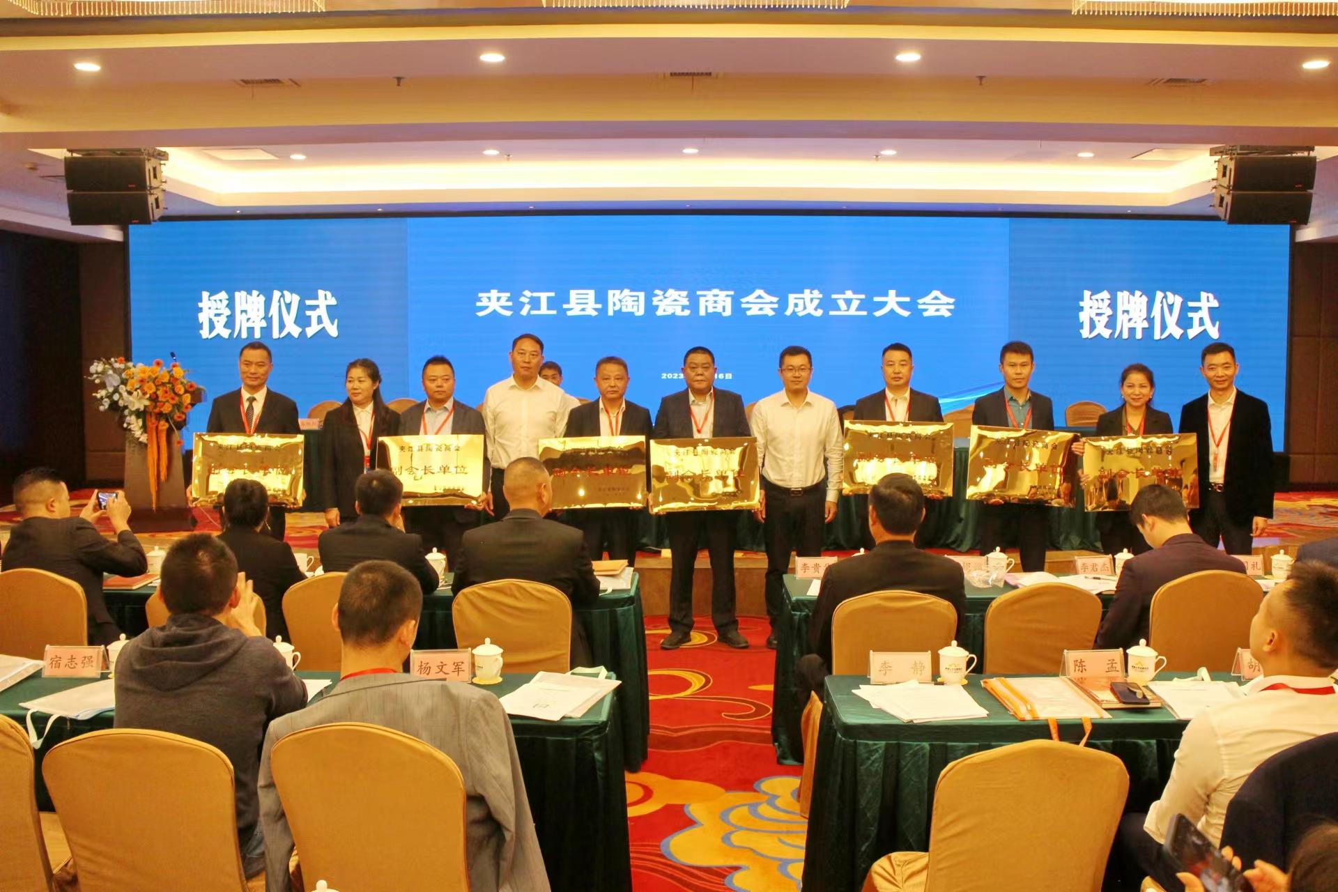会上,县委、县政府发表了贺信:夹江县陶瓷商会的成立,不仅为夹江陶瓷企业家提供共创商机、维护权益的坚实载体,还为推动夹江与全国各地深化陶瓷行业交流、促进夹江民营经济高质量发展提供崭新平台。夹江县委、县政府永远和商会心连心,永远是商会的坚强后盾,希望商会以此为新的起点,发扬吃苦耐劳、团结奋斗、开拓进取的精神,努力拼搏、致力发展,展现夹江陶瓷行业新气象;希望商会切实承担起规范和壮大夹江陶瓷行业发展的重任,在资源整合、市场开发、商品调节、物流调控等方面做出新贡献;希望商会积极支持夹江各项决策部署、主动参与夹江各项重要活动,共同推动夹江经济社会高质量发展再上新台阶。