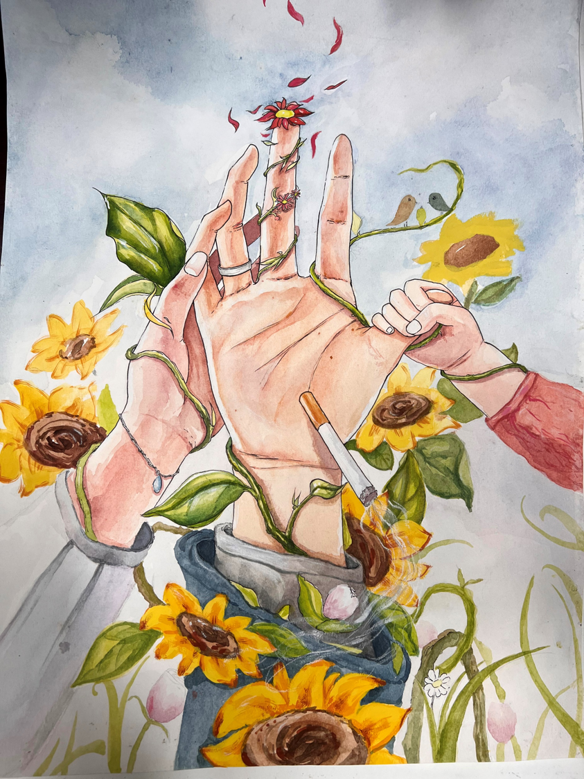 吸烟源于什么?源于无法自控。这样的事情却要让最爱我们的家人来承受。为了最爱我们的人,放下烟,把走错的那一步退回,定会海阔天空,幸福之花定会绽放于指尖。此画展现的是戒烟后的美好画面,无烟的家庭必会阳光明媚。