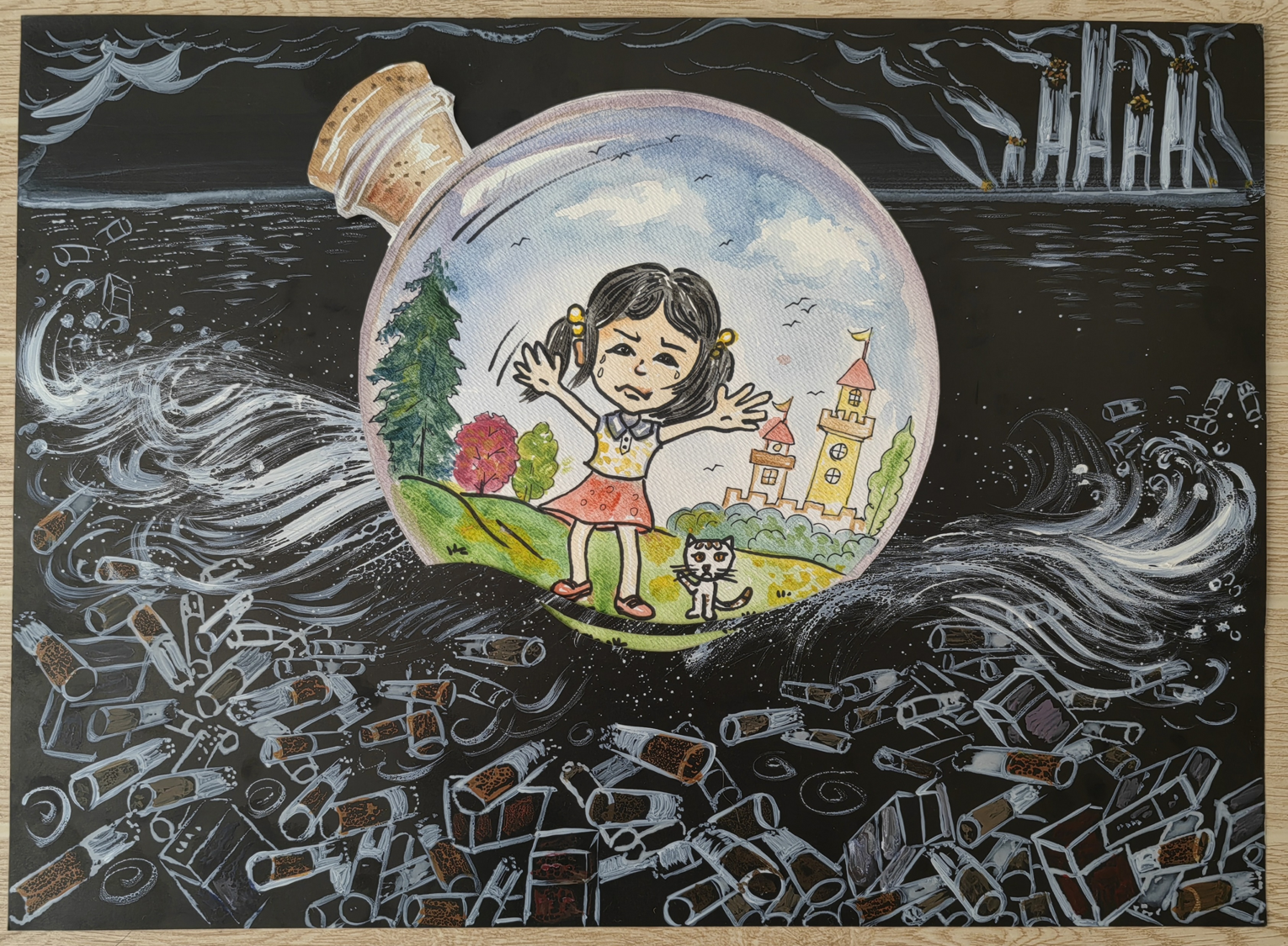 画面创意来自“漂流瓶”,一个小女孩面带愁容与无奈,带着最后的一片净土,告别充满浑浊污垢的家园,漂流瓶被布满烟蒂烟盒的黑色烟海推向她所期望的远方。作者通过画面寓在警示人们远离烟草,崇尚健康,爱护环境。