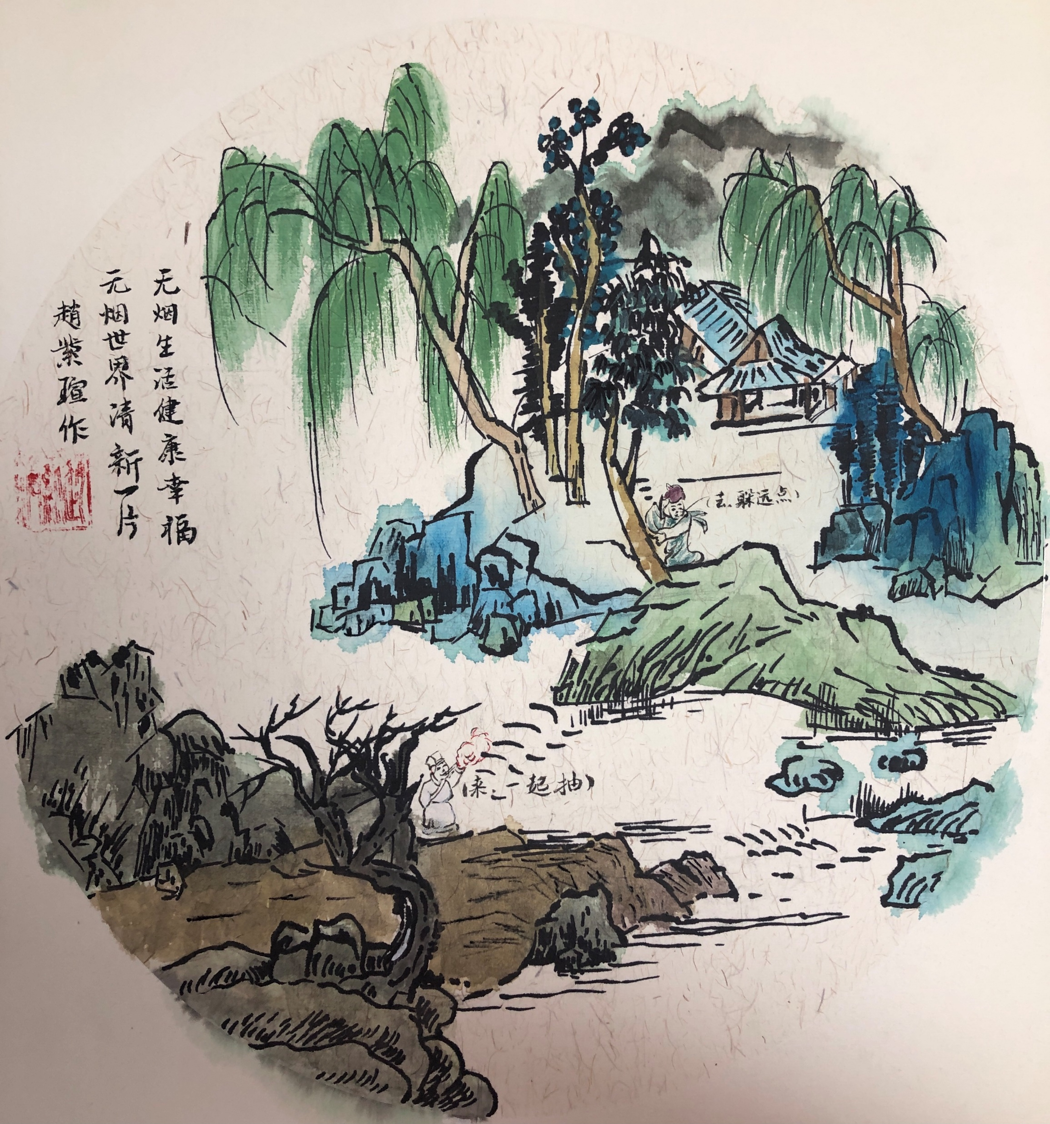 本作品以国画的形式表现“无烟生活健康幸福,无烟世界清新一片”的主题!作品中描绘了两个人物以及两幅不同的风景,甲人物天天吸烟,他所生活的环境枯枝败柳,死气沉沉的,乙人物在甲的召唤下却能做到拒烟、控烟,他所生活的环境则是花红柳绿,生机勃勃,一派世外桃源的美景。