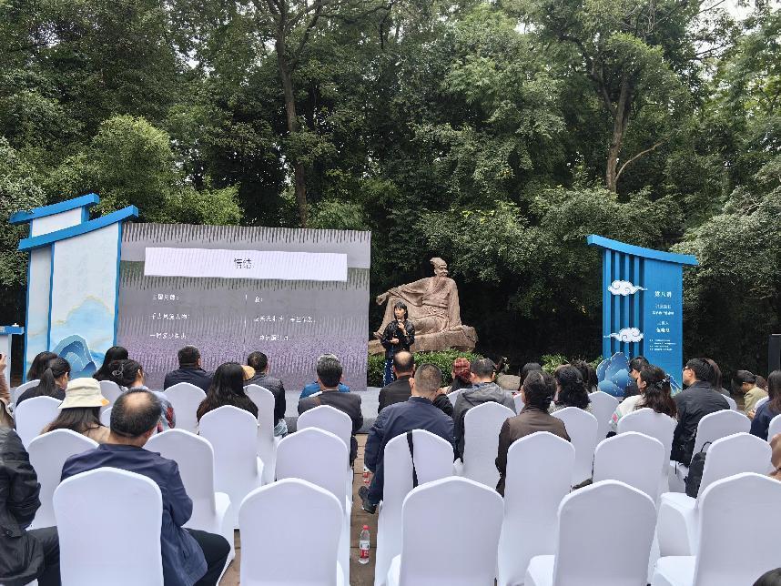 10月20日下午,在四川眉山三苏祠博物馆内,东坡盘陀像处来自四川大学文学与新闻学院的副教授伍晓蔓为现场的观众深情地朗诵和解读着苏东坡三咏赤壁的诗赋,她以“苏轼三游赤壁的心灵提升之旅”为题,从心理分析入手,解读三咏赤壁的过程中,苏轼心态的变化。