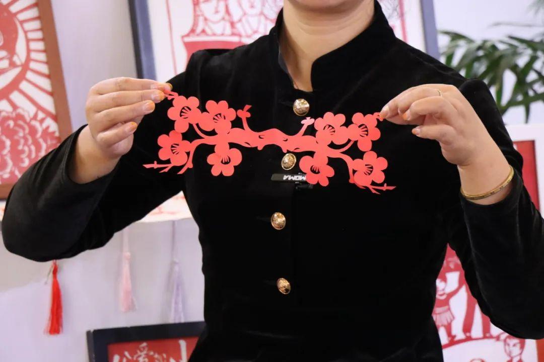 杨秀莲现场还表演了剪纸“戏法”,一份红纸在手,剪刀咔嚓咔嚓,转身的功夫,一副对称的梅花剪纸就跃然在眼前。