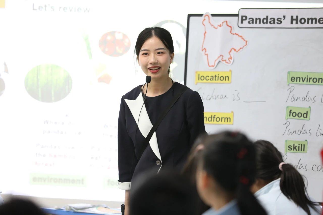 随后进入课例展示环节。钟佩玥老师执教的《Panda Base》是在英语教学中融合国际理解教育的课例,课例设计基于蓉城地域特色和学生学情进行了建构。英语组团队以“应熊猫基地邀请,请孩子们用英语介绍自己喜爱的熊猫”这一情景引入,让课堂链接真实情景,提供学生学习支架进行特色文化交流。