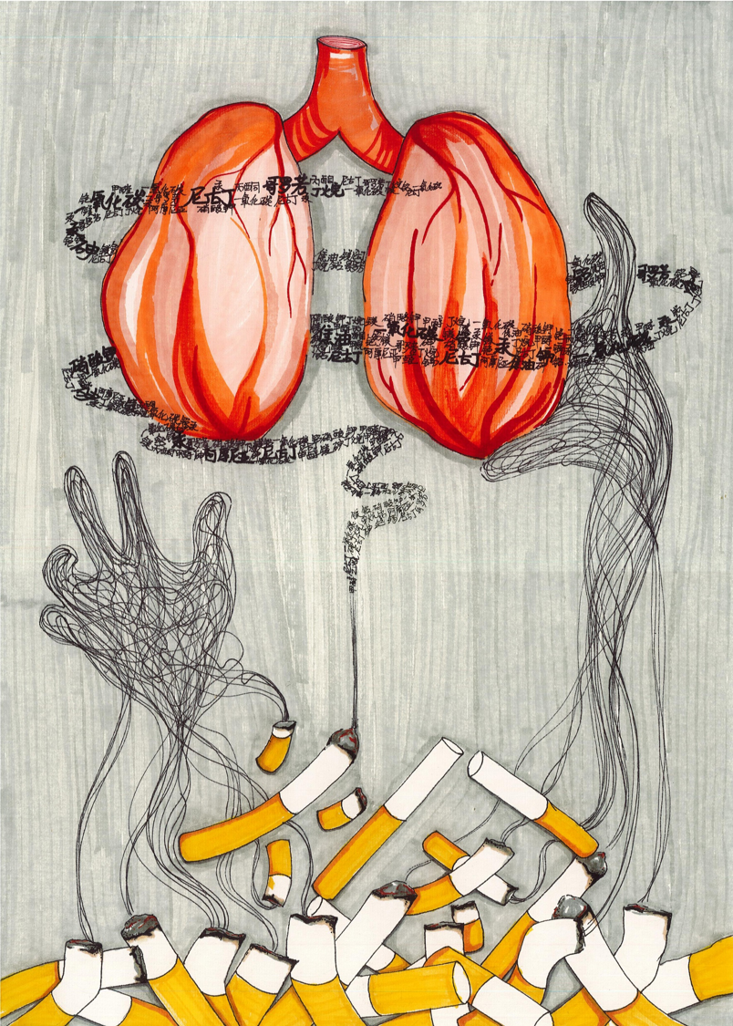 吸烟对人身体尤其肺部产生不好的影响,会产生各种病变。烟 气缭绕的环境更是禁锢着所处抽烟人身边的人的健康,吸烟带给人的只有健康上的坏处,短时的快乐只会禁锢人们健康生活的步伐。