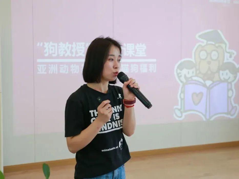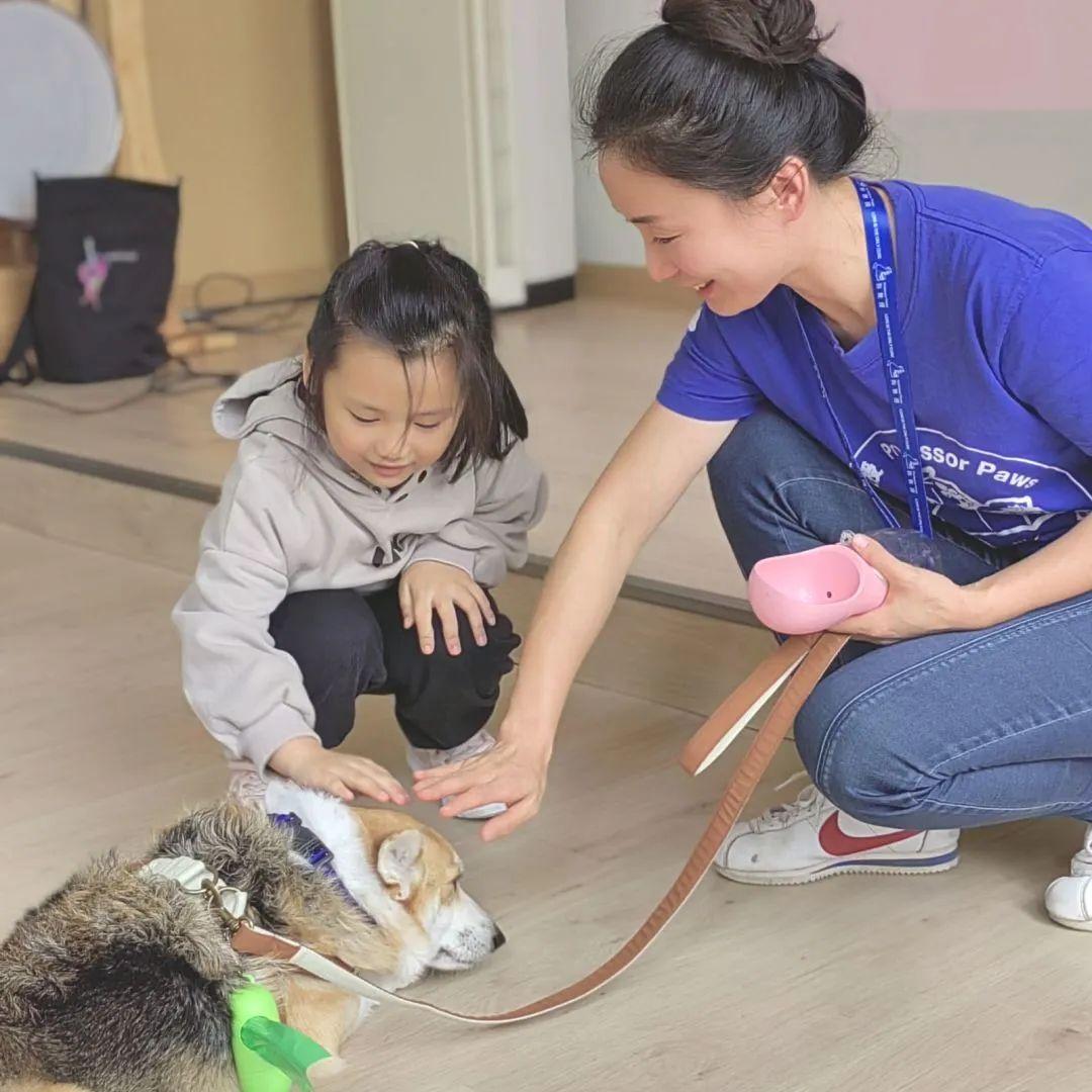 在“布丁”的配合下,亚洲动物基金的兰老师带大家一起了解了狗狗的习性,以及如何分辨动物的情绪。根据介绍,孩子们了解到很多狗狗有自己的职业和工作,例如:治疗犬、导盲犬、缉毒犬,“布丁”就是一名持证上岗的治疗犬,它们会在各种领域为人类提供帮助,是大家的好朋友。