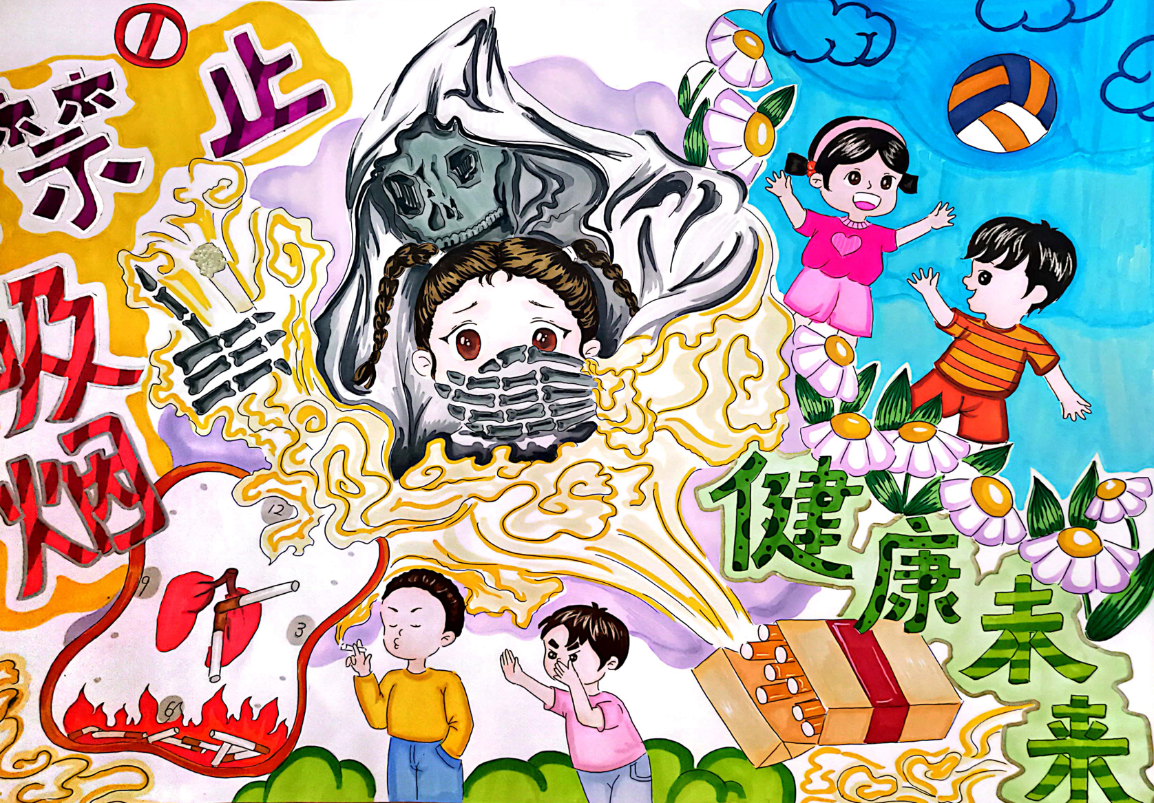 呼吁人们共同努力、禁止吸烟,创造一个健康未来.以鲜明的配色和图像来吸引观众的注意力。