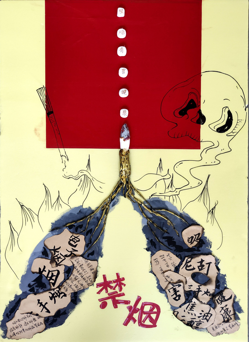 作者细致刻画了人体的肺部,特意采用熏烧的方式将这种病态描摹更好体现人体的肺部已经被烟进行了多次的伤害。而这一切的罪魁祸首就是肺部的“香烟”。