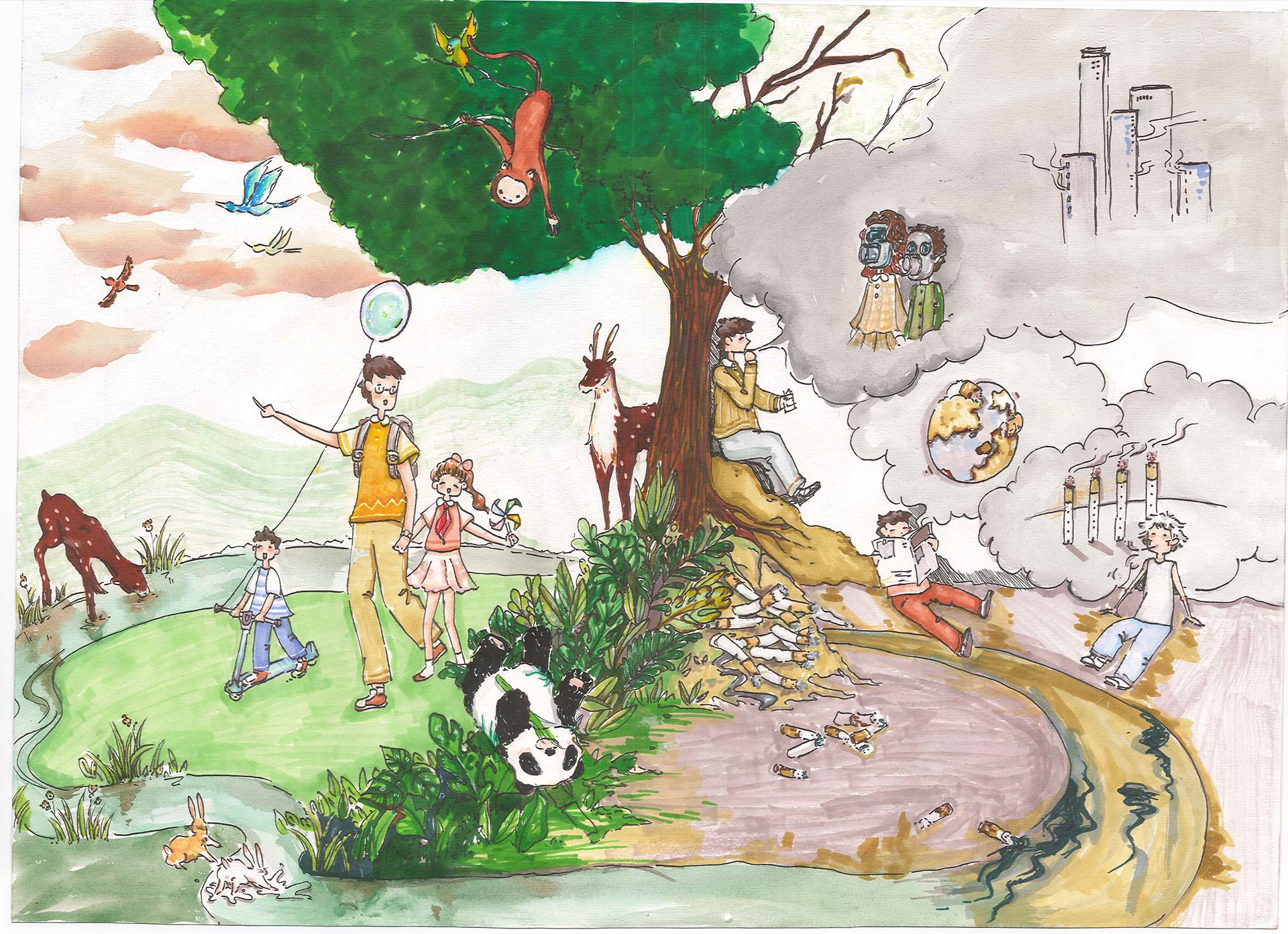 本画是单幅儿童画,以马克笔和水彩绘制;画面内容旨在表达“拒绝吸烟,还我们一个清新美好家园”的愿望。