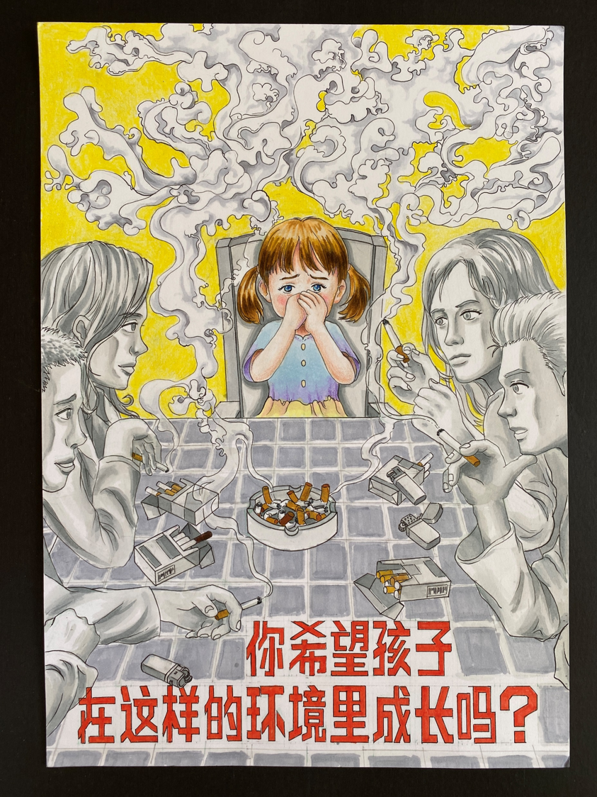 二手烟对小朋友的健康成长影响很大,你希望小朋友在这样烟雾弥漫的环境里成长吗?刻不容缓,戒烟吧,共创无烟家庭。
