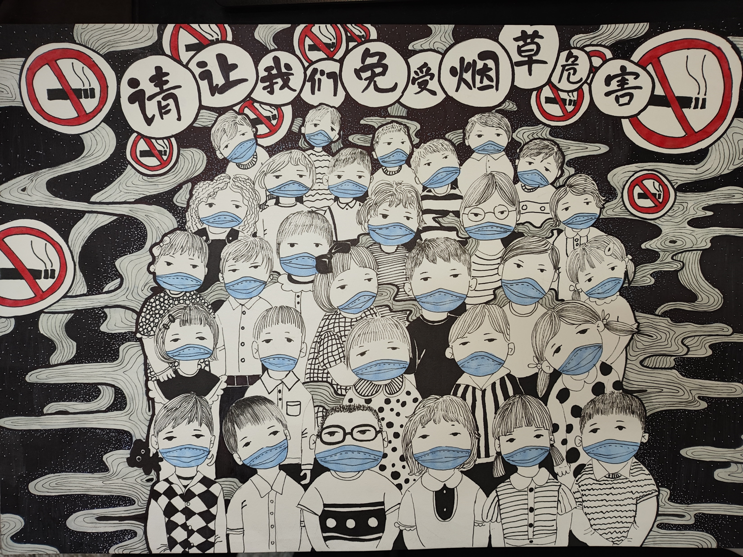 本画以黑白画为主要表现形式,禁烟的红、口罩的蓝、烟雾的灰,使画面对比强烈。主体是学生,学生周围已满是烟雾,以及很多小点一样的烟灰,整张画都在告诉大家,为了孩子的健康,请禁止吸烟。