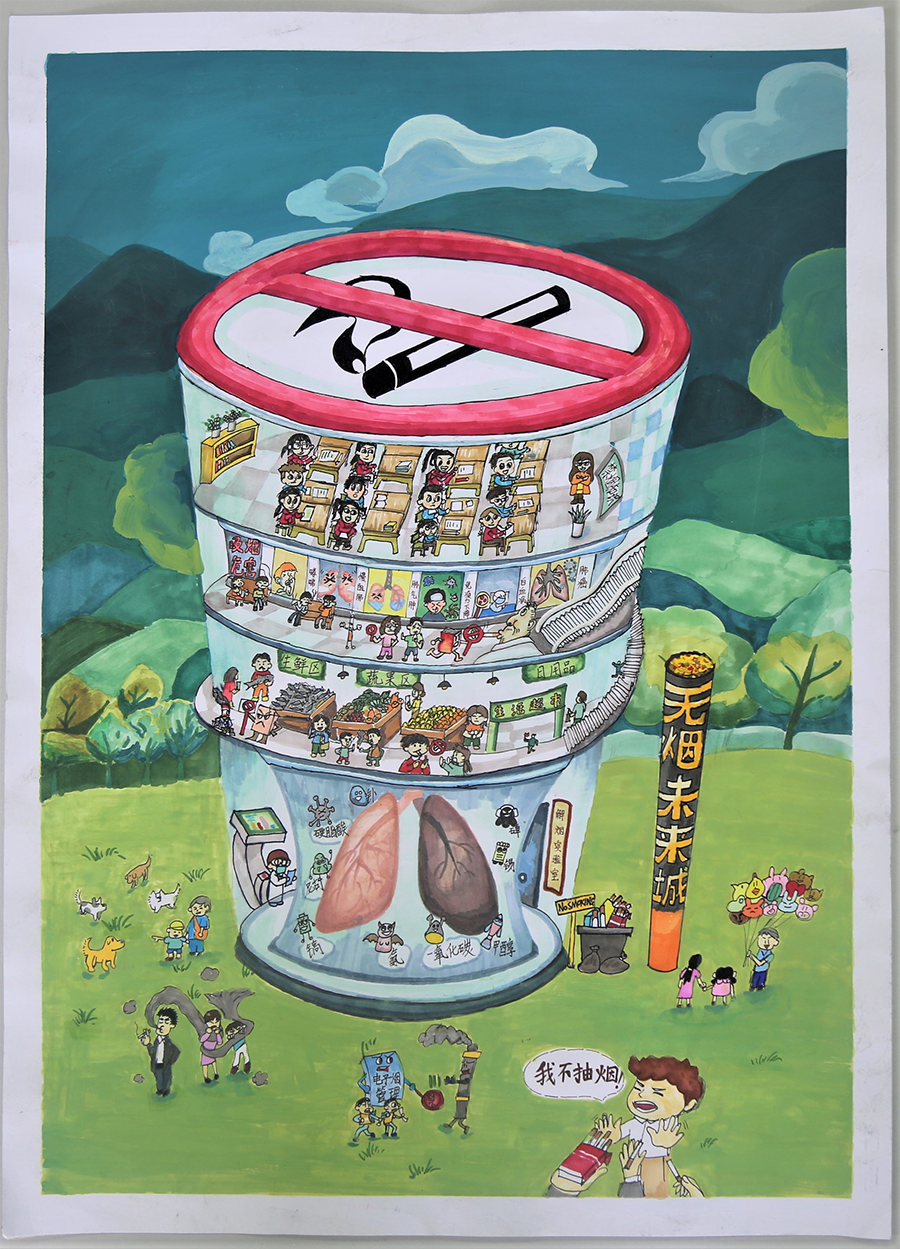 作品表现的是大山里的一座无烟未来城,楼层中心建筑造型是一个禁止吸烟标志,城里的人对禁烟意识很高,未来城的一、二楼是一所大型解烟实验室,供研究人员专研使用,三楼是无烟生活超市,四楼是禁烟知识宣传,比如吸烟带来的危害有哪些?五楼是师生课堂,禁烟知识从小就抓起。