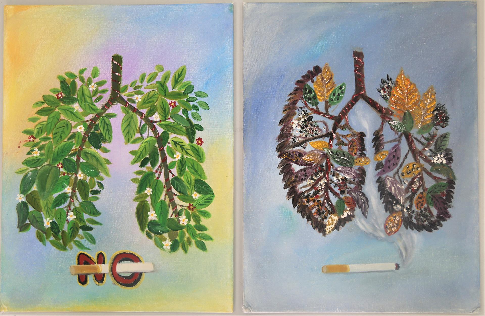 《菸•晟》:菸,读【yān】义同烟;读【yū】,释义:枯萎。晟,释义:旺盛,兴旺。此组画命名为《菸·晟》欲以告戒人们吸烟有害身体健康!禁止吸烟,还人类一个干净清新,生命旺盛的“绿”肺。